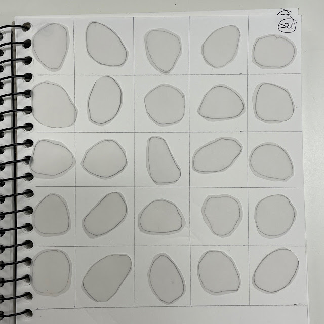 So I drew and cut 25 pebbles shapes out of tracing paper and drew up a grid in my journal and wondered. Placed randomly in the grid, I liked their subtle movement and individuality.