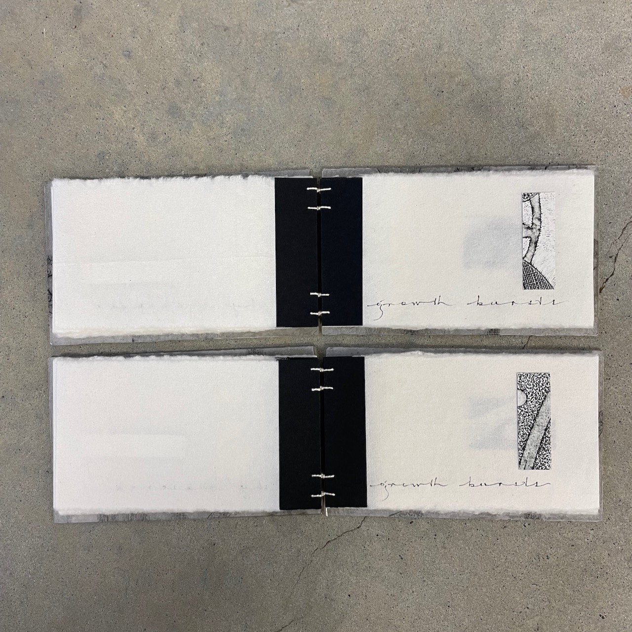 Because I always make two books - siblings, not twins - I tried to find two lots of imagery within the prints that expressed the notions of new growth and emergence.